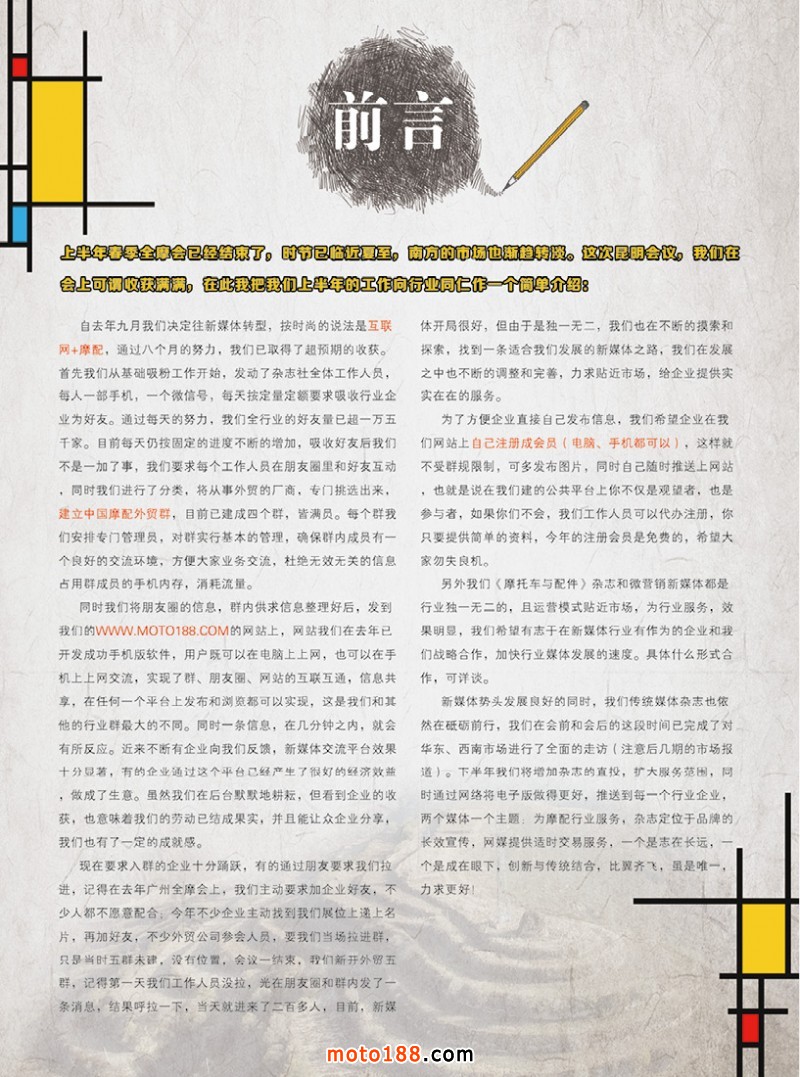 新媒體勢頭發展良好的同時,我們傳統媒體雜志也依然在砥礪前行,我們在會前和會后的這段時間已完成了對華東、西南市場進行了全面的走訪(注意后幾期的市場報道)。下半年我們將增加雜志的直投,擴大服務范圍,同時通過網絡將電子版做得更好,推送到每一個行業企業,兩個媒體一個主題:為摩配行業服務,雜志定位于品牌的長效宣傳,網媒提供適時交易服務,一個是志在長遠,一個是成在眼下,創新與傳統結合,比翼齊飛,雖是唯一,力求更好!
