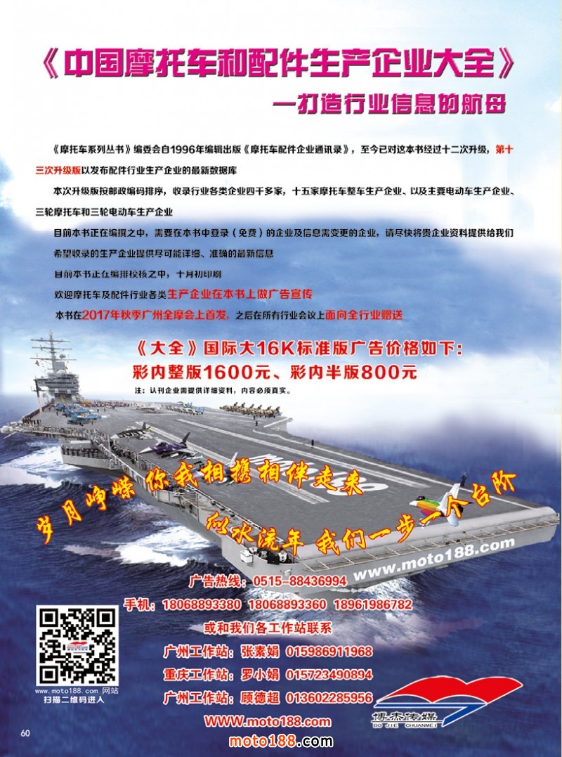 另外我們《摩托車與配件》雜志和微營銷新媒體都是行業獨一無二的,且運營模式貼近市場,為行業服務,效果明顯,我們希望有志于在新媒體行業有作為的企業和我們戰略合作,加快行業媒體發展的速度。具體什么形式合作,可詳談。