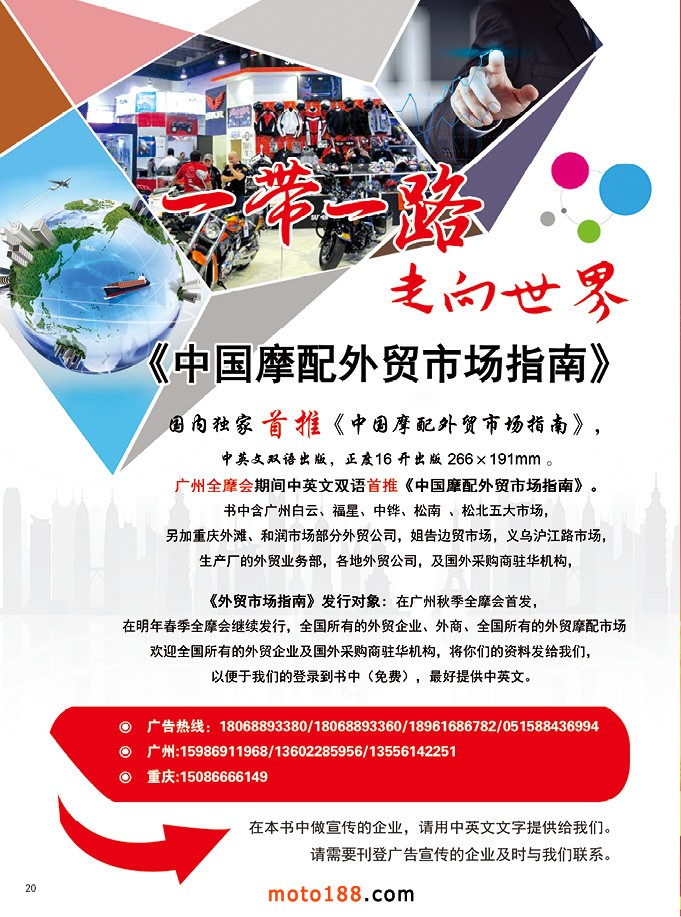 今年十一月份中汽全摩會繼續在廣州召開,為了做好外貿服務工作,抓住一帶一路走向世界的發展契機,我們將我們的外貿數據庫整理發布給業內人士,在廣州全摩會正式推出首版《中國摩配外貿市場指南》,用中英文雙語出版,正度16開,尺寸為266×181毫米。