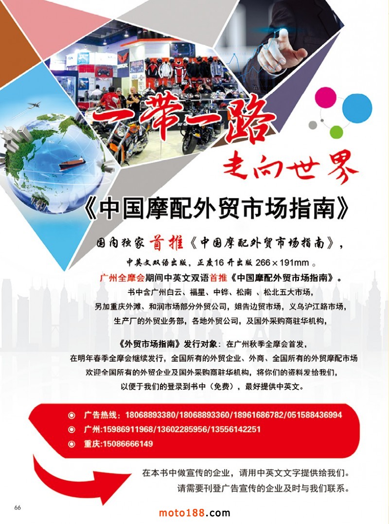 今年九月下旬在廣州中國進出口商品交易會展館有一個定位于摩配外貿的行業會議,這次會議主辦單位也花費了不少精力和心血,我們根據情況也將參加。今年十一月份中旬傳統的中汽摩配會在廣州保利世貿博覽館再次召開,我們在會上將隆重推出《中國摩托車配件外貿市場指南》這本書和我們所有的市場指南有所不同: