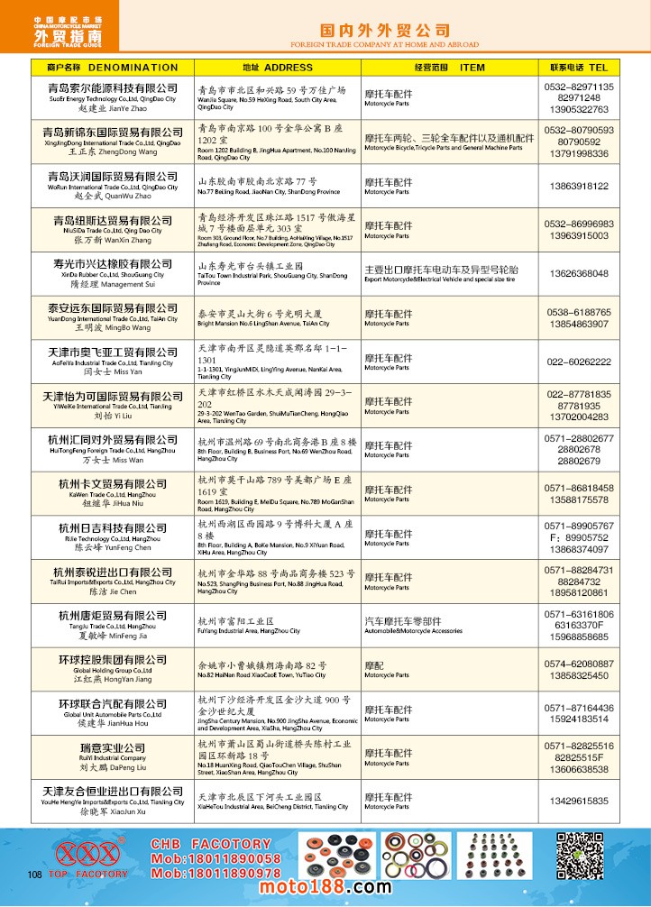由《摩托車與配件》雜志社,在國內(nèi)首次獨家推出的《中國摩托車配件外貿(mào)市場指南》工具書正式面世。這是一本專業(yè)定位于外貿(mào)企業(yè)的工具書,隨著一帶一路發(fā)展戰(zhàn)略的推進,更多企業(yè)走出國門,將產(chǎn)品銷往世界各地,本書收集了國內(nèi)主要從事摩托車配件外貿(mào)的工廠、商家、國外部分駐華采購機構(gòu)等資料匯總而成.
