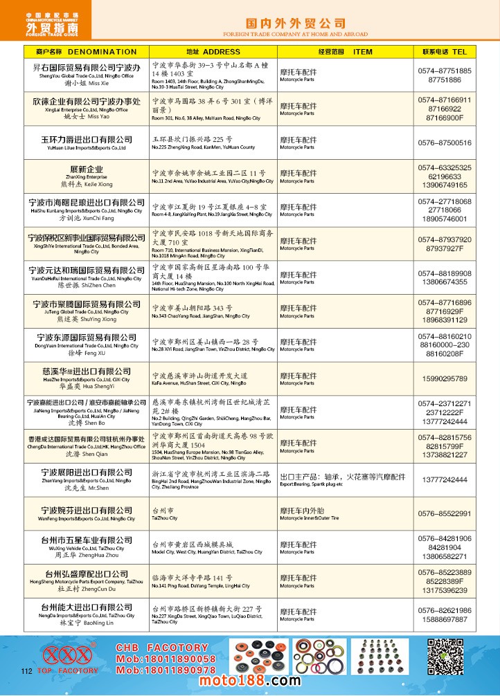 由《摩托車與配件》雜志社,在國(guó)內(nèi)首次獨(dú)家推出的《中國(guó)摩托車配件外貿(mào)市場(chǎng)指南》工具書(shū)正式面世。這是一本專業(yè)定位于外貿(mào)企業(yè)的工具書(shū),隨著一帶一路發(fā)展戰(zhàn)略的推進(jìn),更多企業(yè)走出國(guó)門(mén),將產(chǎn)品銷往世界各地,本書(shū)收集了國(guó)內(nèi)主要從事摩托車配件外貿(mào)的工廠、商家、國(guó)外部分駐華采購(gòu)機(jī)構(gòu)等資料匯總而成.