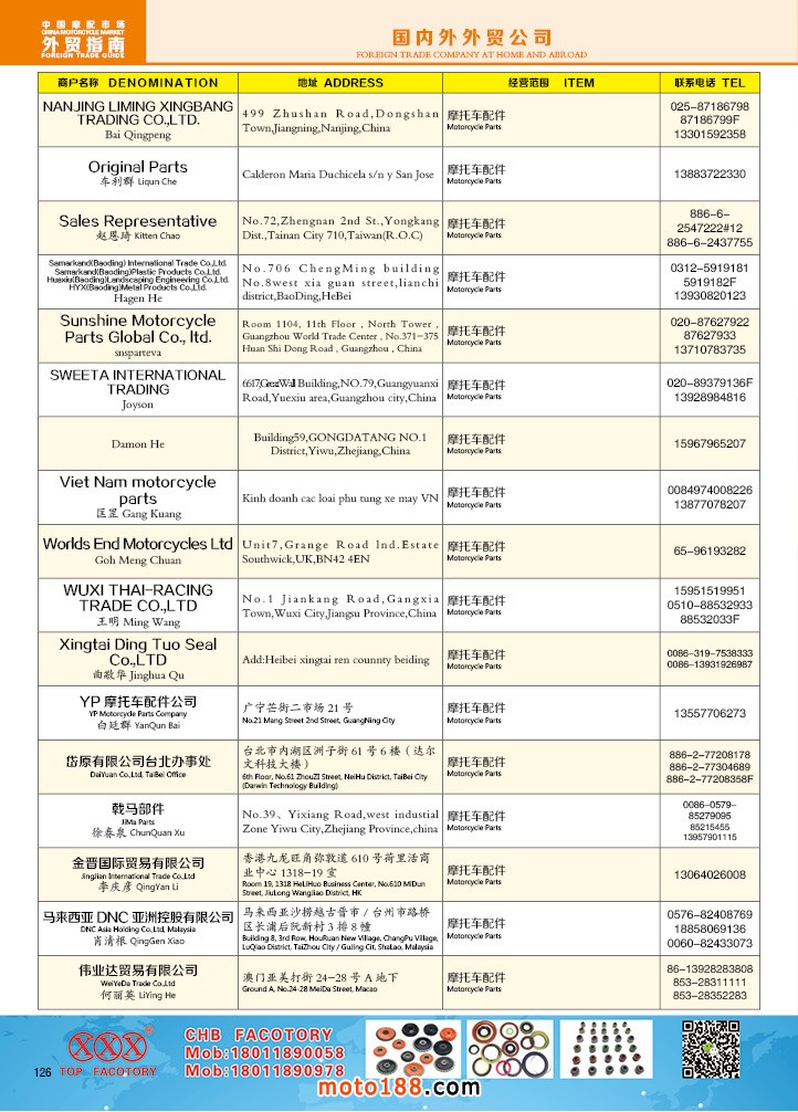 由《摩托車與配件》雜志社,在國內首次獨家推出的《中國摩托車配件外貿市場指南》工具書正式面世。這是一本專業定位于外貿企業的工具書,隨著一帶一路發展戰略的推進,更多企業走出國門,將產品銷往世界各地,本書收集了國內主要從事摩托車配件外貿的工廠、商家、國外部分駐華采購機構等資料匯總而成.
