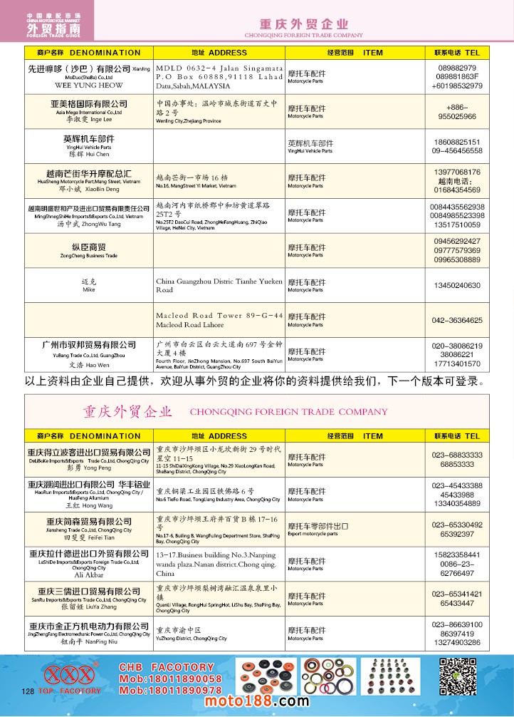 由《摩托車與配件》雜志社,在國內首次獨家推出的《中國摩托車配件外貿市場指南》工具書正式面世。這是一本專業定位于外貿企業的工具書,隨著一帶一路發展戰略的推進,更多企業走出國門,將產品銷往世界各地,本書收集了國內主要從事摩托車配件外貿的工廠、商家、國外部分駐華采購機構等資料匯總而成.