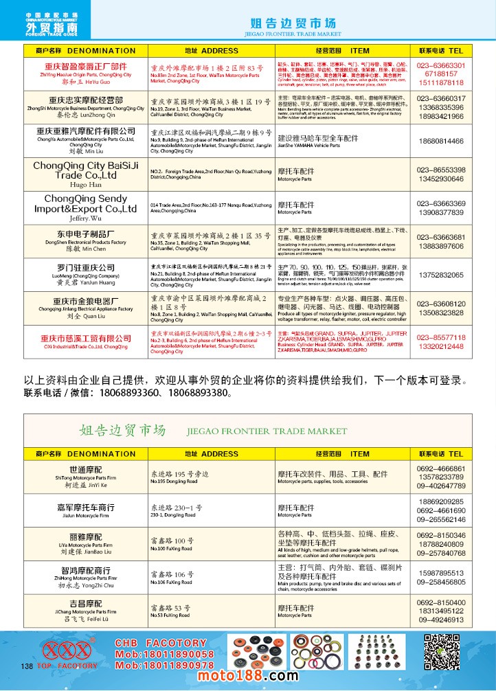 由《摩托車與配件》雜志社,在國內(nèi)首次獨家推出的《中國摩托車配件外貿(mào)市場指南》工具書正式面世。這是一本專業(yè)定位于外貿(mào)企業(yè)的工具書,隨著一帶一路發(fā)展戰(zhàn)略的推進(jìn),更多企業(yè)走出國門,將產(chǎn)品銷往世界各地,本書收集了國內(nèi)主要從事摩托車配件外貿(mào)的工廠、商家、國外部分駐華采購機構(gòu)等資料匯總而成.