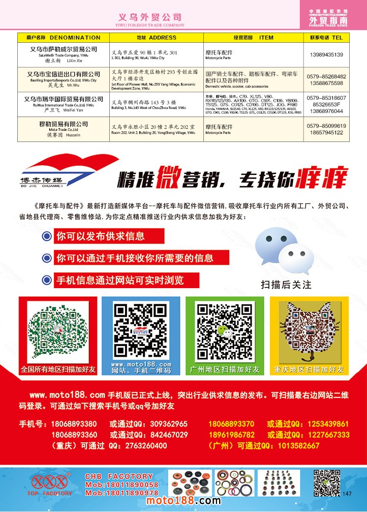 由《摩托車與配件》雜志社,在國內首次獨家推出的《中國摩托車配件外貿市場指南》工具書正式面世。這是一本專業定位于外貿企業的工具書,隨著一帶一路發展戰略的推進,更多企業走出國門,將產品銷往世界各地,本書收集了國內主要從事摩托車配件外貿的工廠、商家、國外部分駐華采購機構等資料匯總而成.