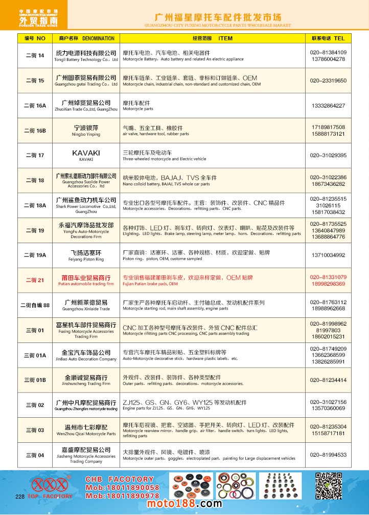 由《摩托車與配件》雜志社,在國內首次獨家推出的《中國摩托車配件外貿市場指南》工具書正式面世。這是一本專業定位于外貿企業的工具書,隨著一帶一路發展戰略的推進,更多企業走出國門,將產品銷往世界各地,本書收集了國內主要從事摩托車配件外貿的工廠、商家、國外部分駐華采購機構等資料匯總而成.