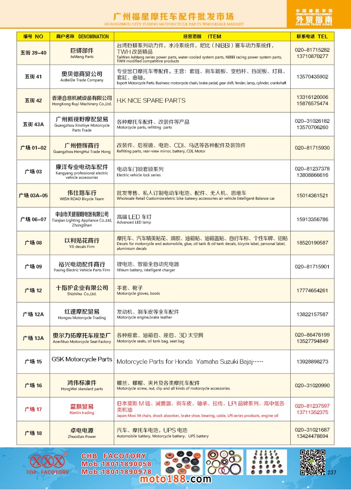 由《摩托車與配件》雜志社,在國內(nèi)首次獨家推出的《中國摩托車配件外貿(mào)市場指南》工具書正式面世。這是一本專業(yè)定位于外貿(mào)企業(yè)的工具書,隨著一帶一路發(fā)展戰(zhàn)略的推進,更多企業(yè)走出國門,將產(chǎn)品銷往世界各地,本書收集了國內(nèi)主要從事摩托車配件外貿(mào)的工廠、商家、國外部分駐華采購機構(gòu)等資料匯總而成.