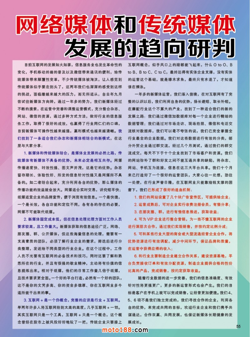 對發行模式進行了變革,采用了直投的方式,加大了對二三級市場的郵寄投放量,使雜志進入到二三級市場;通過微信朋友圈和微信群的推送,發送到每一個好友;再加上moto188網站線上和線下的瀏覽;以及市場的原有的發行網絡,雜志形成了立體化的發行。