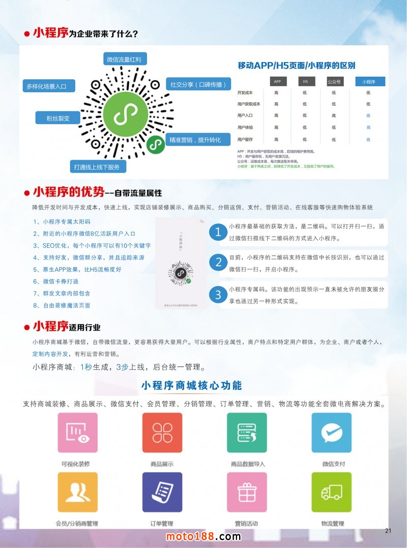 這期雜志及近一階段的工作重點(diǎn)是向行業(yè)推廣微信小程序,自2017年1月9日,微信小程序正式上線,實(shí)現(xiàn)了觸手可及的夢(mèng)想,用戶掃一掃或者搜一下即可打開應(yīng)用,無需安裝或卸載。運(yùn)用微信開放平臺(tái),共享8億微信用戶,全新平臺(tái)流量入口,引領(lǐng)行業(yè)變革,不需安裝app,將巨大流量導(dǎo)向自有平臺(tái),打通微信里的每一個(gè)用戶。有關(guān)小程序的介紹和運(yùn)用及建立商城等有關(guān)說明和報(bào)價(jià),詳見本期雜志? 20~23頁。