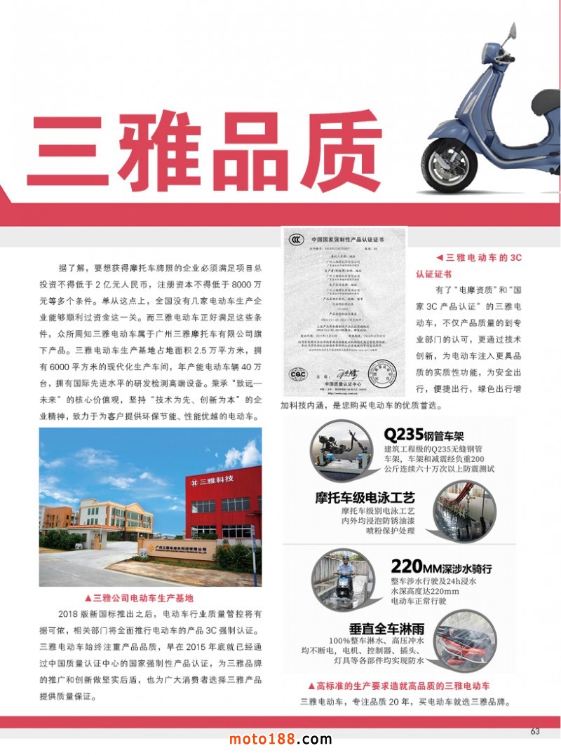 2018.3月《摩托車/電動車與配件》雜志,歡迎大家閱讀日期:2018-03-06 點擊:1270 查看原圖 全部展開![]() ![]() ![]() 內(nèi)63 3C認(rèn)證加電摩資質(zhì)助力三雅品質(zhì)