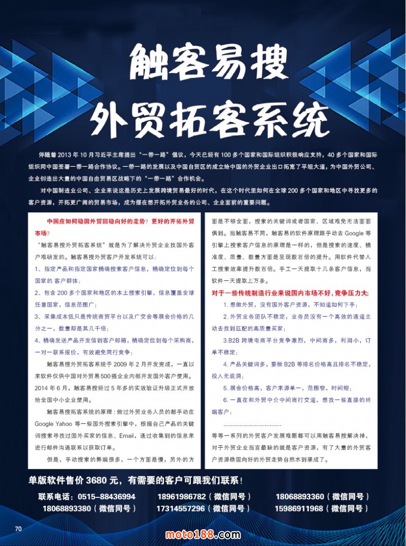 3、為了突破傳統的營銷手段和模式,充分發揮互聯網的作用。我們向行業引進了幾款外貿及小程序軟件,通過互聯網絡,運用軟件搜索,尋找全球的摩托車配件買家。