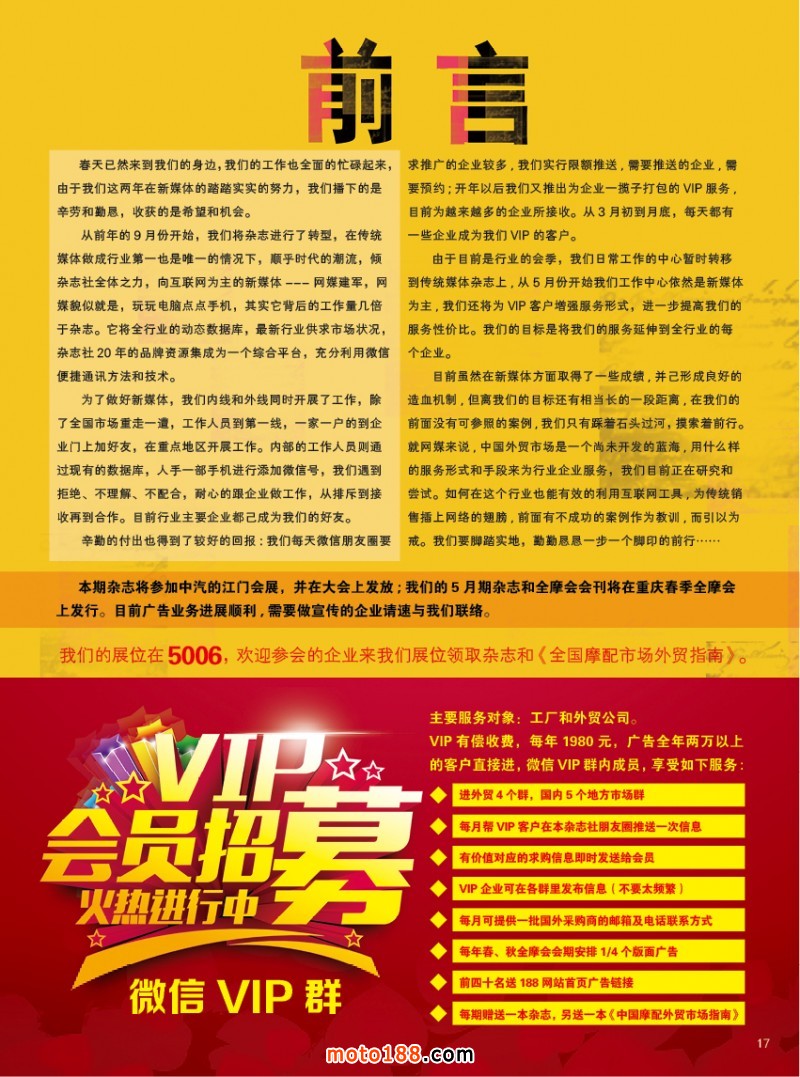 我們的展位在5006,歡迎參會的企業來我們展位領取雜志和《全國摩配市場外貿指南》。