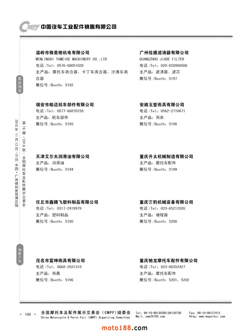 內108 第75屆(2018春)全國摩托車及配件展示交易會-重慶站參展企業信息