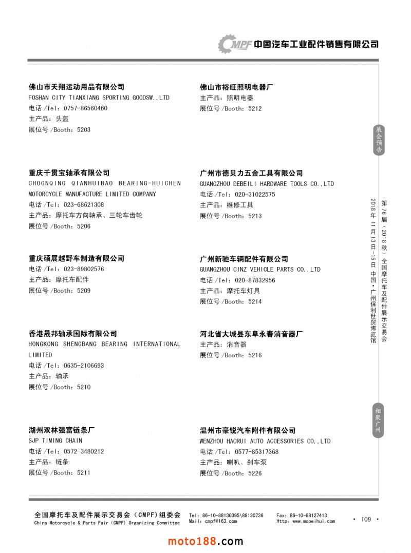 內109 第75屆(2018春)全國摩托車及配件展示交易會-重慶站參展企業信息