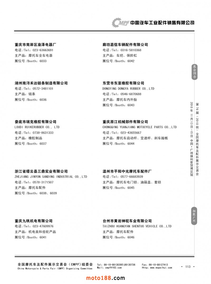 內(nèi)113 第75屆(2018春)全國(guó)摩托車(chē)及配件展示交易會(huì)-重慶站參展企業(yè)信息