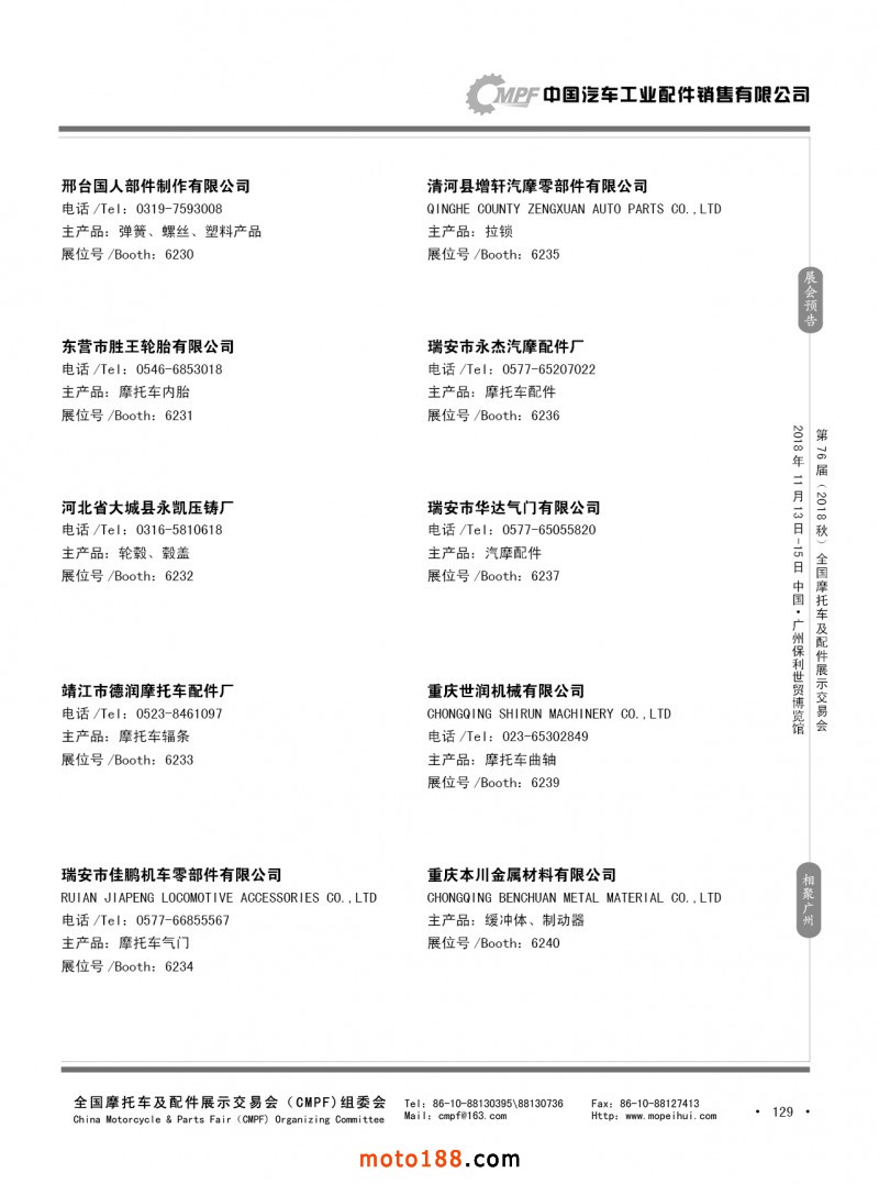 內(nèi)129 第75屆(2018春)全國摩托車及配件展示交易會-重慶站參展企業(yè)信息