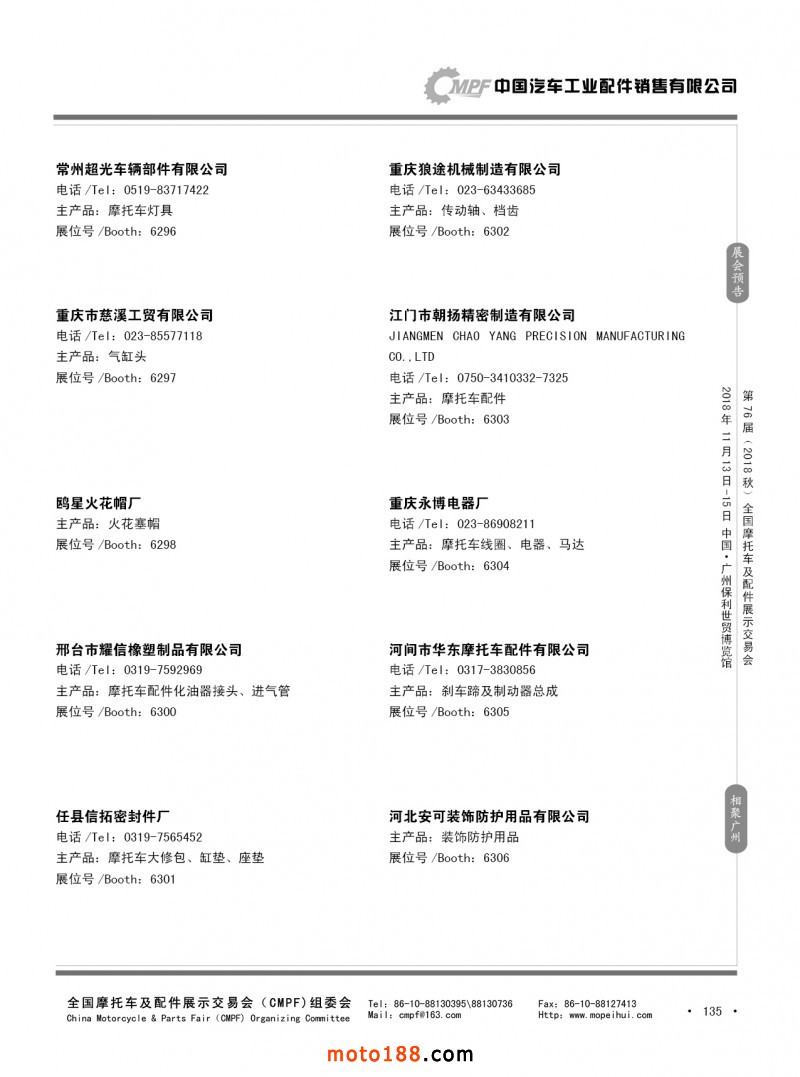 內(nèi)135 第75屆(2018春)全國(guó)摩托車及配件展示交易會(huì)-重慶站參展企業(yè)信息