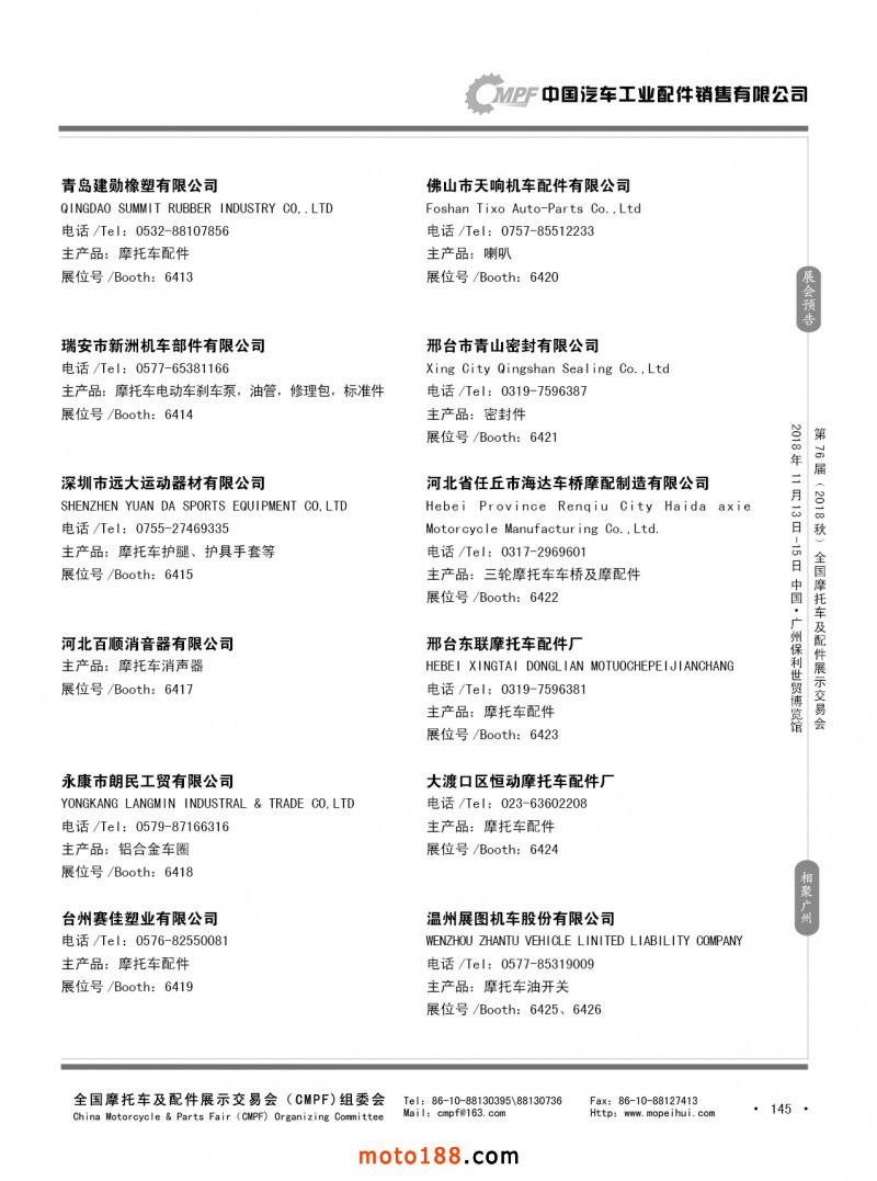 內(nèi)145 第75屆(2018春)全國摩托車及配件展示交易會(huì)-重慶站參展企業(yè)信息