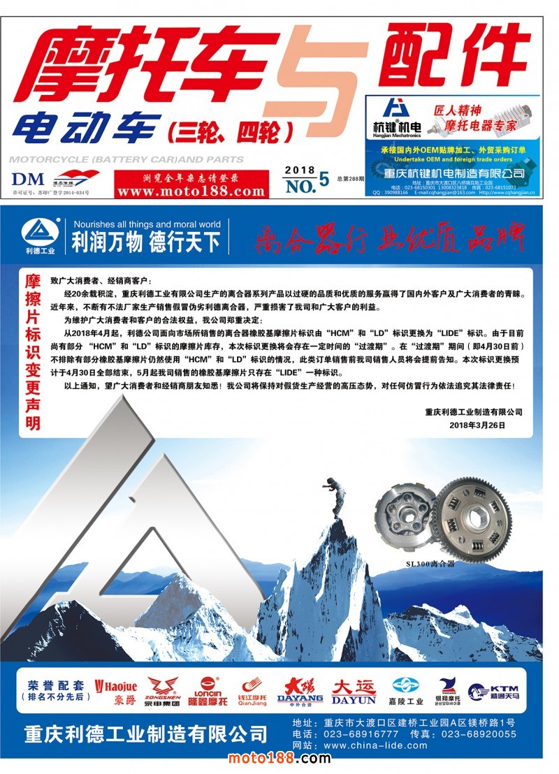2018.5月《摩托車/電動(dòng)車與配件》雜志,歡迎大家閱讀日期:2018-04-25 點(diǎn)擊:1896 查看原圖 全部展開![]() ![]() ![]() 封面 重慶利德工業(yè)制造有限公司