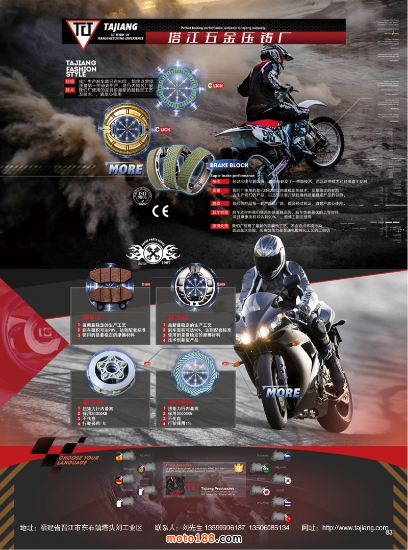 從今年的6月到10月上旬,我們還將對16年編撰的《摩配華南市場指南》進行升級,中英文雙語出版,新版本將在下半年第76屆廣州全國摩托車及配件展示交易會首發;并在廣州重慶摩配市場全面派送;在廣州福星、松南市場門口、及白云210/002/607三個檔口常年設立發行窗口;發行至廣州、重慶、江浙的主要廠家,目前收集整理、核對校正信息,編排翻譯的工作正在進行之中,需要在最新《華南市場指南》升級版做宣傳的企業,請和我們以及各地的工作站人員聯絡。