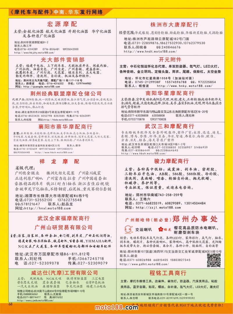從現在到10月上旬,我們還將對16年編撰的《摩配華南市場指南》進行升級,中英文雙語出版,新版本將在下半年第76屆廣州全國摩托車及配件展示交易會首發;并在廣州重慶摩配市場全面派送;在廣州福星、松南市場門口、及白云210/002/607三個檔口常年設立發行窗口;發行至廣州、重慶、江浙的主要廠家,目前收集整理、核對校正信息,編排翻譯的工作正在進行之中,需要在最新《華南市場指南》升級版做宣傳的企業,請和我們以及各地的工作站人員聯絡。