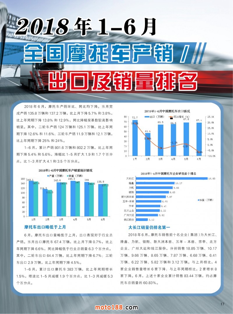 內17 2018年1-6月全國摩托車產銷出口及銷量排名