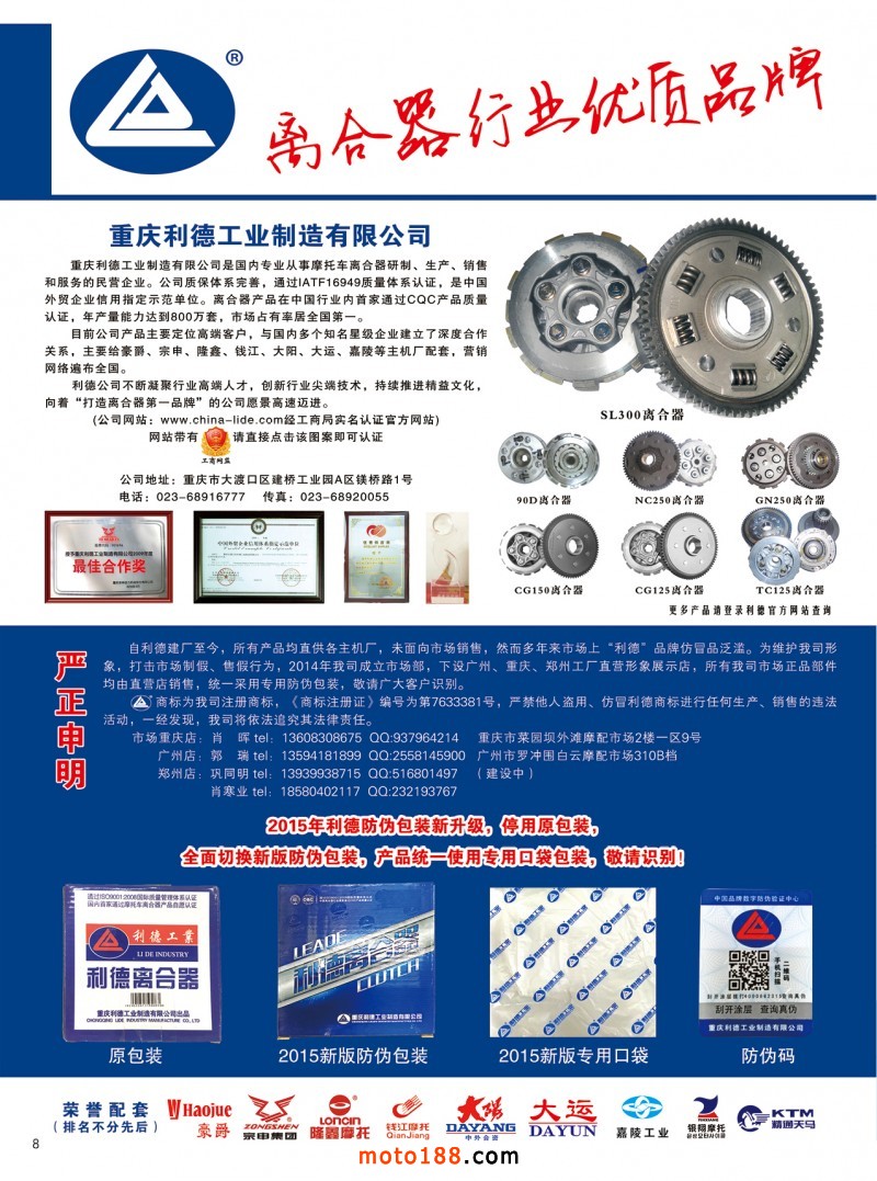 《摩托車與配件》(正在考慮是否變更為《電·摩配件》)不僅服務于摩配業之外,將重點增加電動車業(二、三、四輪)的信息服務;同時增加小型通機內容(涉及工、農、林、牧、副、漁、建等產業)信息服務;壓縮出刊期數,適當減少廣告的版面,突出雜志的內容,增加原創內容,增加可閱讀性,使雜志形成一定的風格,將雜志辦成典藏版的精品,每期都有收藏價值;改變現有發行模式,電子版將發送至每一個好友;紙質版實行精準投放,有償發行,直達目標受眾,具體為每個市場的發行,按我們提供的名單,由發行代理送雜志上門,我們按數量直接支付現金作為發行費。權威性、收藏性、獨特性、可讀性這是明年雜志必須具備的特點。明年雜志特殊版面的征集工作已經開始,壓縮期數后,特定版面的數量將減少,先定先得。