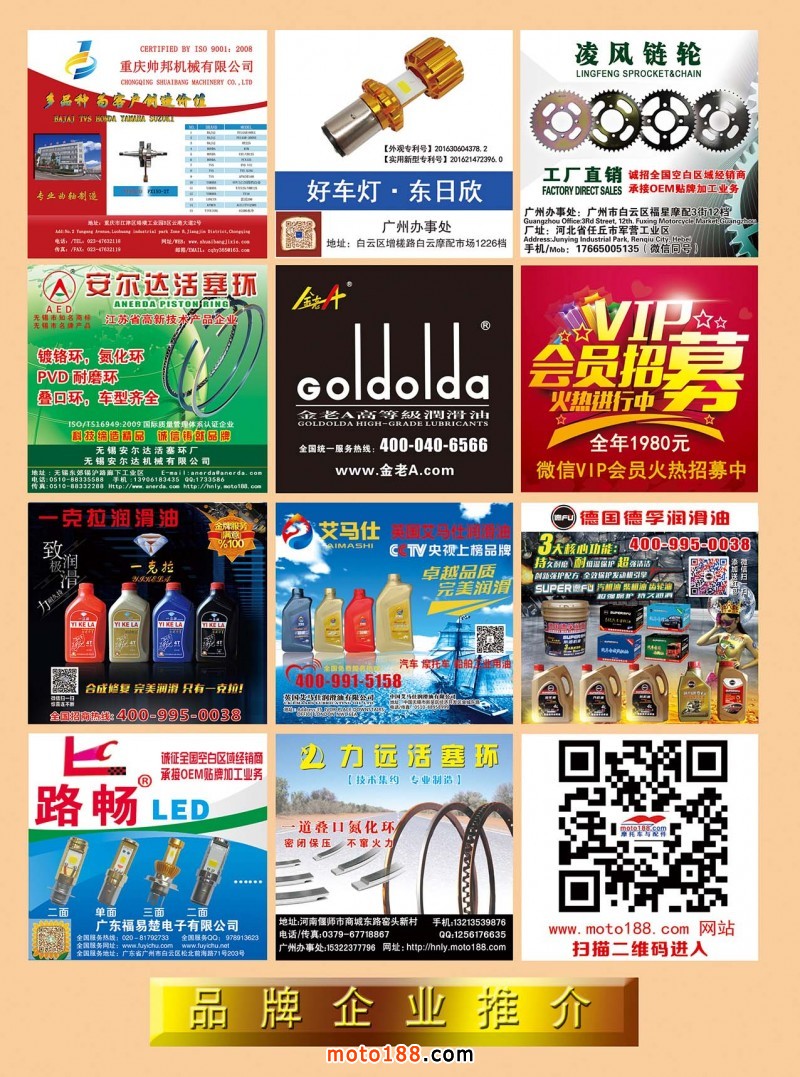 《摩托車與配件》(正在考慮是否變更為《電·摩配件》)不僅服務于摩配業之外,將重點增加電動車業(二、三、四輪)的信息服務;同時增加小型通機內容(涉及工、農、林、牧、副、漁、建等產業)信息服務;壓縮出刊期數,適當減少廣告的版面,突出雜志的內容,增加原創內容,增加可閱讀性,使雜志形成一定的風格,將雜志辦成典藏版的精品,每期都有收藏價值;改變現有發行模式,電子版將發送至每一個好友;紙質版實行精準投放,有償發行,直達目標受眾,具體為每個市場的發行,按我們提供的名單,由發行代理送雜志上門,我們按數量直接支付現金作為發行費。權威性、收藏性、獨特性、可讀性這是明年雜志必須具備的特點。明年雜志特殊版面的征集工作已經開始,壓縮期數后,特定版面的數量將減少,先定先得。