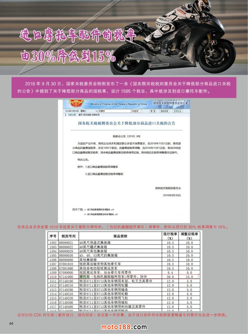 內(nèi)44 進(jìn)口摩托車配件的稅率由30%降低到15%