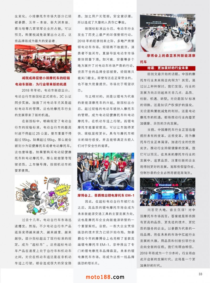 目前電動車新國標即將實行,3C標準的強制認證,國家新能源的戰略布局,也將給中國摩托車和電動車產業帶來革命性的變化,催生出未來的產品摩電或電摩:既有摩托車的速度和續駛里程,又有電動車的靜音無污染的工況…目前越來越多的企業,正在朝著這個方向努力,并且已經生產出不錯的產品,并推向市場,申請生產資質的企業增多,隨著產品性能的提高和完善,相應的配套政策出臺,消費者不斷的增加,新能源電摩將會是市場新的消費熱點,我們未雨綢繆提早布局于這個未來新興市場,我們雜志也將定位于《電摩與配件》。  同時我們的服務形式也將逐步以新媒體來取代傳統媒體,今年大力度的壓縮出刊期數,增加更多的新媒體的服務新形式,用更快捷、經濟、方便、有效的方式和手段來服務于未來的企業。