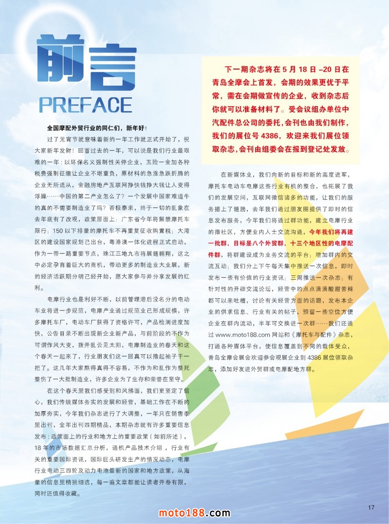 在這個(gè)春天里我們感受到和風(fēng)拂面,我們更堅(jiān)定了信心,我們傳統(tǒng)媒體務(wù)實(shí)的發(fā)展和經(jīng)營,基礎(chǔ)工作在不斷的加厚夯實(shí),今年我們雜志進(jìn)行了大調(diào)整,一年只在銷售季里出刊,全年出刊四期精品,本期雜志就有許多重要信息發(fā)布:政策面上的行業(yè)和地方上的重要政策(如前所述),18年的市場數(shù)據(jù)匯總分析,通機(jī)產(chǎn)品技術(shù)介紹 ,行業(yè)有關(guān)的重要國際資訊,國際巨頭研發(fā)生產(chǎn)的情況動(dòng)態(tài),電摩行業(yè)電動(dòng)三四輪及動(dòng)力電池最新的國家和地方政策,從海量的信息里精挑細(xì)選,每一遍文章都能讓讀者開卷有限,同時(shí)還值得收藏。