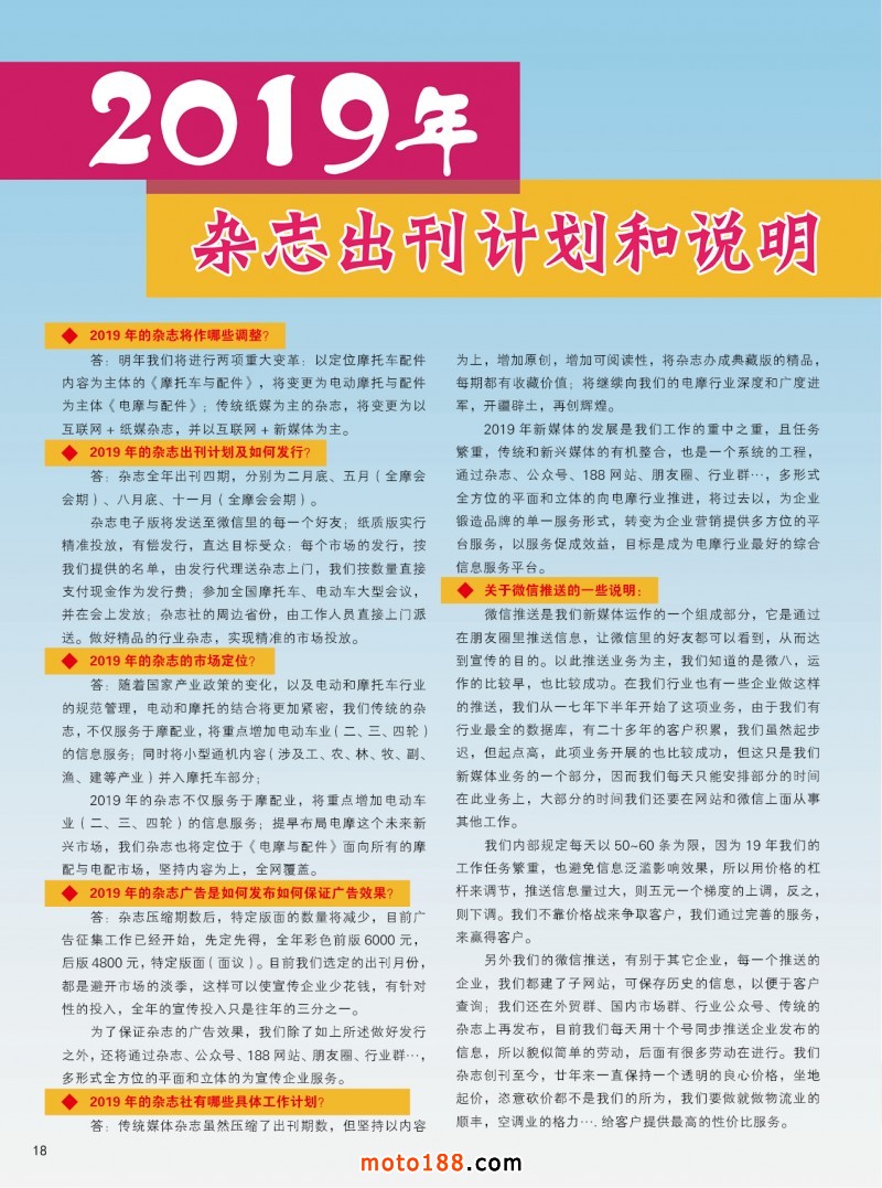 在這個春天里我們感受到和風(fēng)拂面,我們更堅定了信心,我們傳統(tǒng)媒體務(wù)實的發(fā)展和經(jīng)營,基礎(chǔ)工作在不斷的加厚夯實,今年我們雜志進(jìn)行了大調(diào)整,一年只在銷售季里出刊,全年出刊四期精品,本期雜志就有許多重要信息發(fā)布:政策面上的行業(yè)和地方上的重要政策(如前所述),18年的市場數(shù)據(jù)匯總分析,通機產(chǎn)品技術(shù)介紹 ,行業(yè)有關(guān)的重要國際資訊,國際巨頭研發(fā)生產(chǎn)的情況動態(tài),電摩行業(yè)電動三四輪及動力電池最新的國家和地方政策,從海量的信息里精挑細(xì)選,每一遍文章都能讓讀者開卷有限,同時還值得收藏。