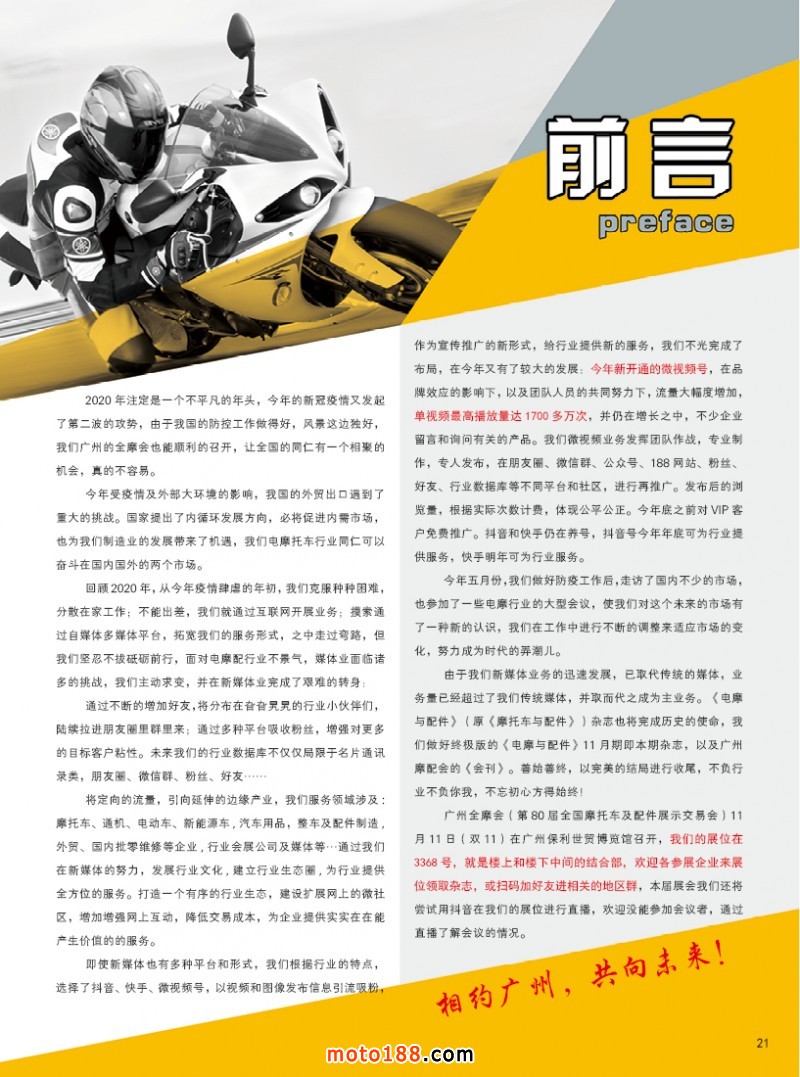 由于我們新媒體業(yè)務(wù)的迅速發(fā)展,已取代傳統(tǒng)的媒體,業(yè)務(wù)量已經(jīng)超過了我們傳統(tǒng)媒體,并取而代之成為主業(yè)務(wù)。《電摩與配件》(原《摩托車與配件》)雜志也將完成歷史的使命,我們做好終極版的《電摩與配件》11月期即本期雜志,以及廣州摩配會的《會刊》。善始善終,以完美的結(jié)局進行收尾,不負行業(yè)不負你我,不忘初心方得始終!