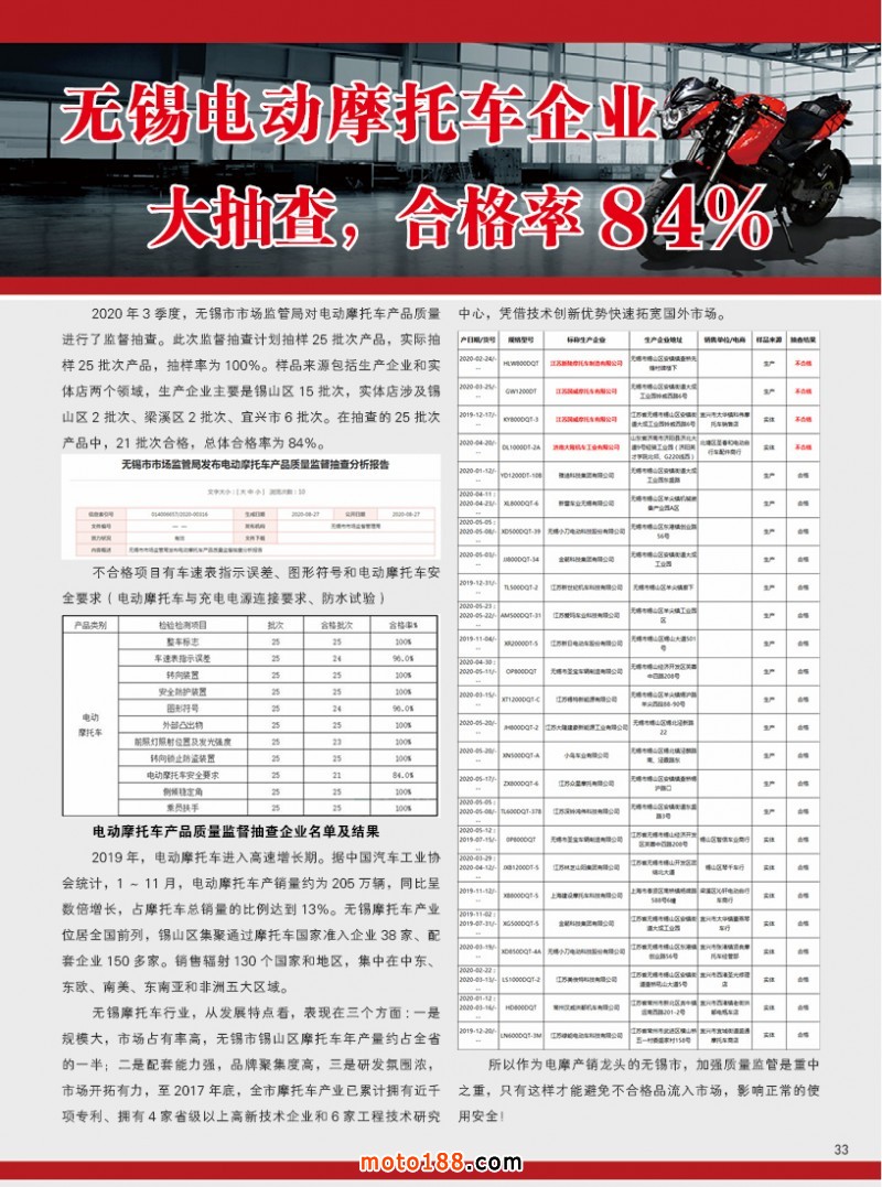 內(nèi)33 無錫電動(dòng)摩托車企業(yè)大抽查,合格率84%