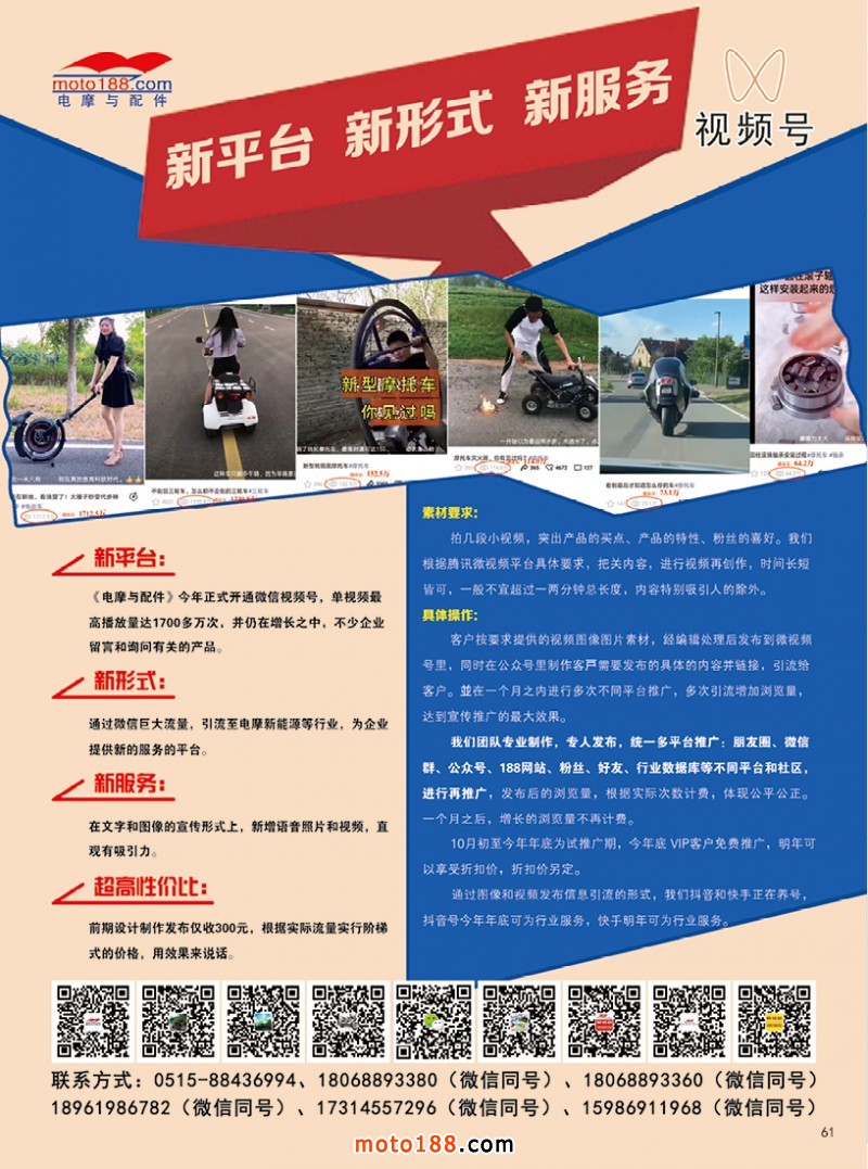 由于我們新媒體業(yè)務(wù)的迅速發(fā)展,已取代傳統(tǒng)的媒體,業(yè)務(wù)量已經(jīng)超過了我們傳統(tǒng)媒體,并取而代之成為主業(yè)務(wù)。《電摩與配件》(原《摩托車與配件》)雜志也將完成歷史的使命,我們做好終極版的《電摩與配件》11月期即本期雜志,以及廣州摩配會的《會刊》。善始善終,以完美的結(jié)局進(jìn)行收尾,不負(fù)行業(yè)不負(fù)你我,不忘初心方得始終!