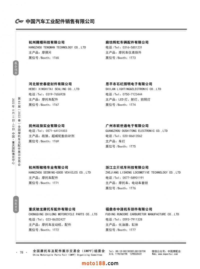內(nèi)78 第82屆(2021秋)全國摩托車及配件展示交易會-廣州站參展企業(yè)信息