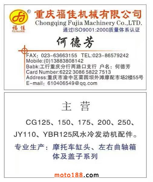 重慶福佳機械有限公司,專業生產:摩托車缸頭、左右曲軸箱體及蓋子系列,聯系方式:023-63663155、13883808142 何德芳。