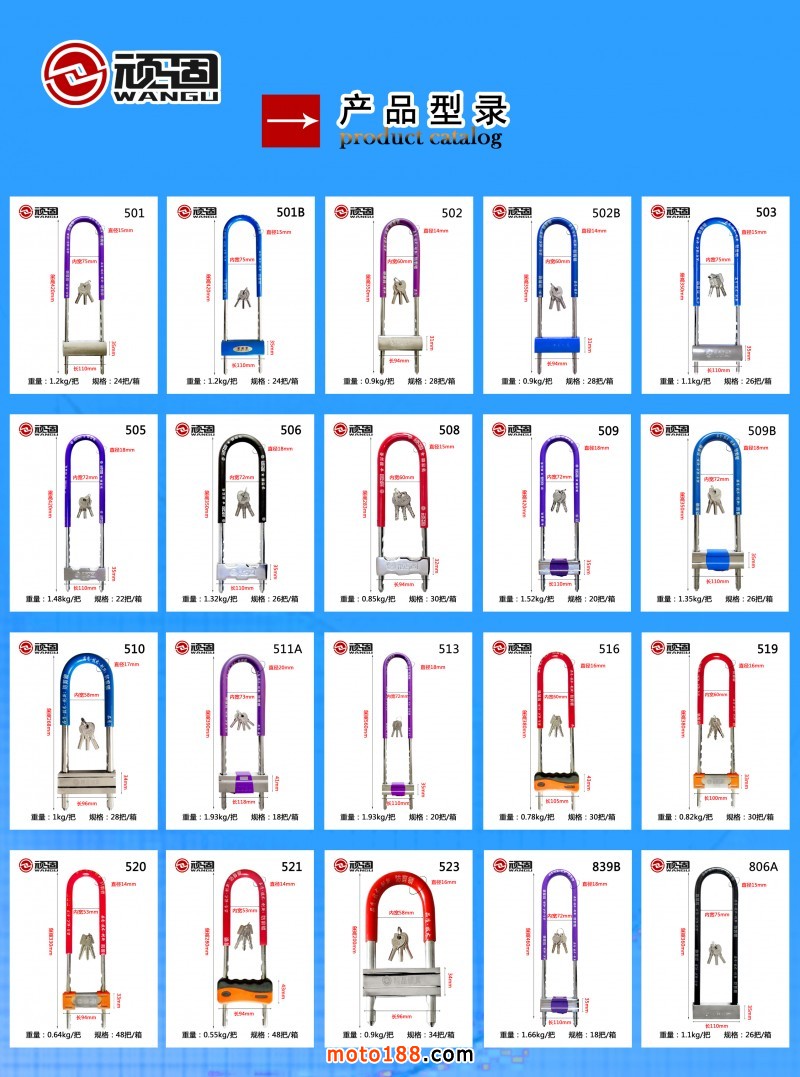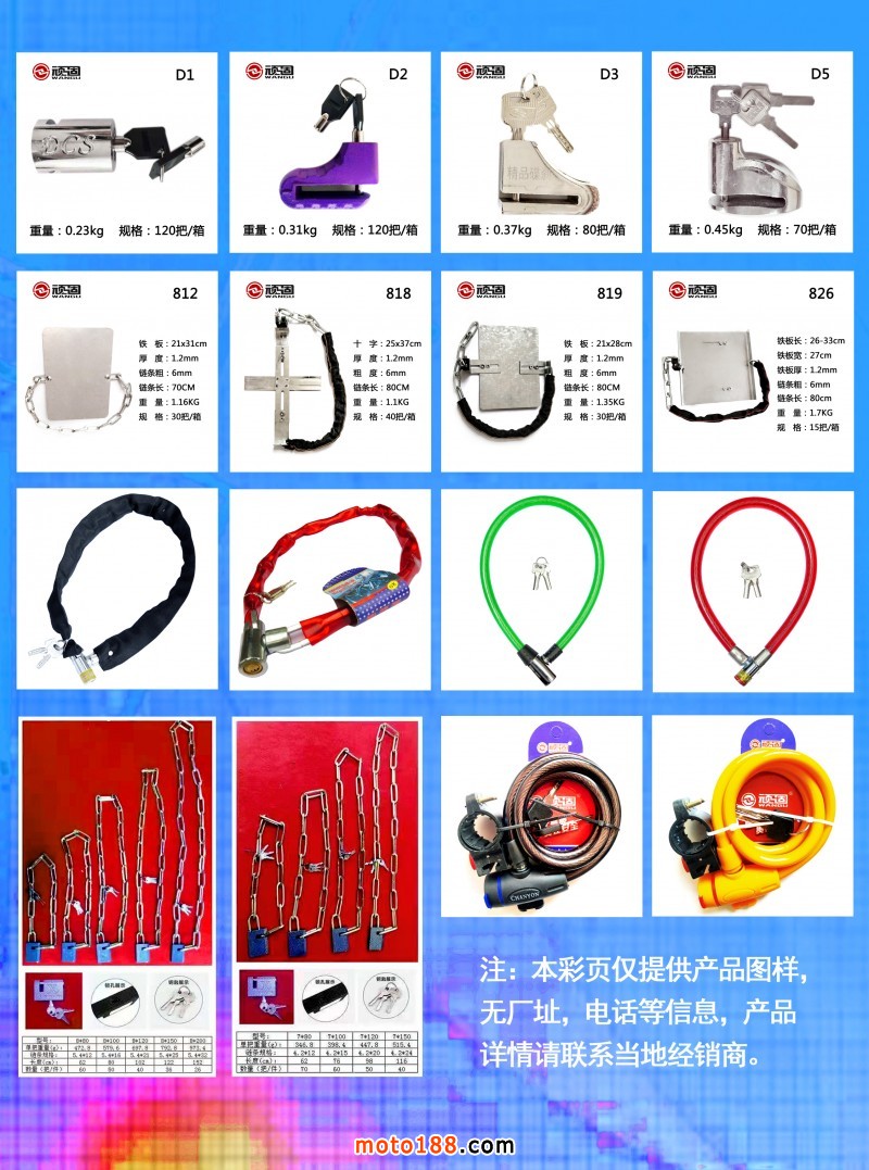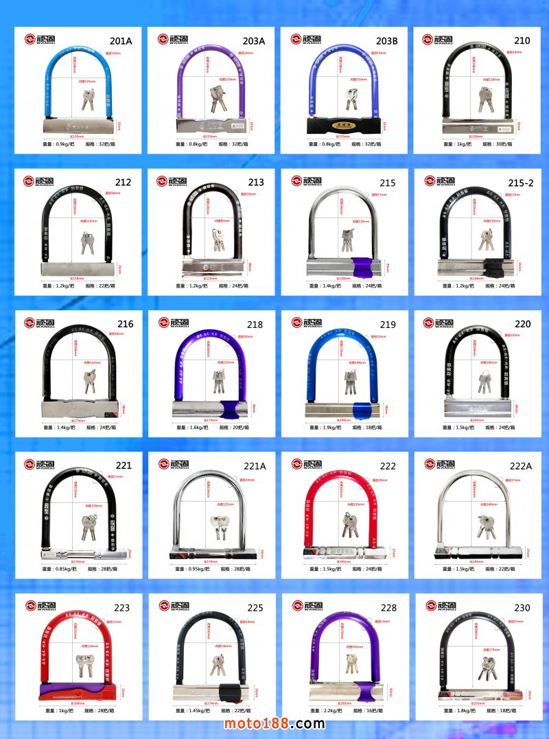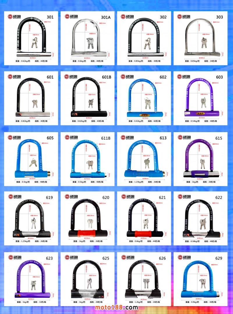 品種涵蓋U型鎖、鋼管鎖、玻璃門插鎖、鏈條鎖、鋼絲鎖、條形所、碟剎鎖、電瓶鎖等。