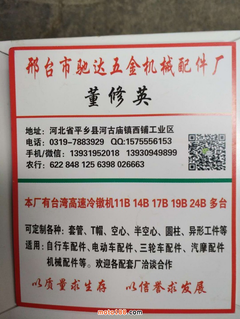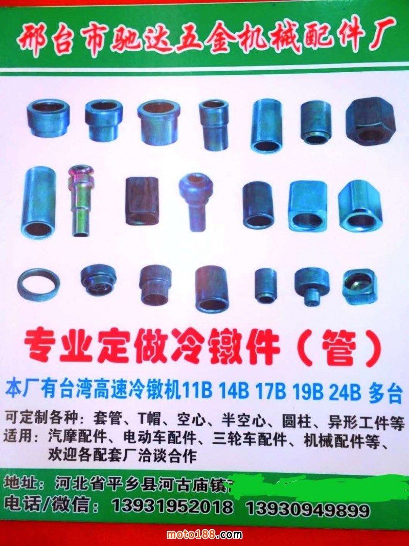 河北邢臺馳達(dá)五金機(jī)械配件廠擁有臺灣機(jī)多臺專業(yè)生產(chǎn)各種冷墩件、管件等異型件,主要用于汽摩配件、機(jī)械配件、五金工具、電動自行車配件、精密機(jī)械配件等均可加工定制(定制直徑5mm-30mm,長度5mm-100mm)。