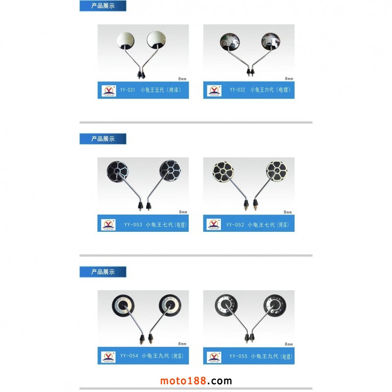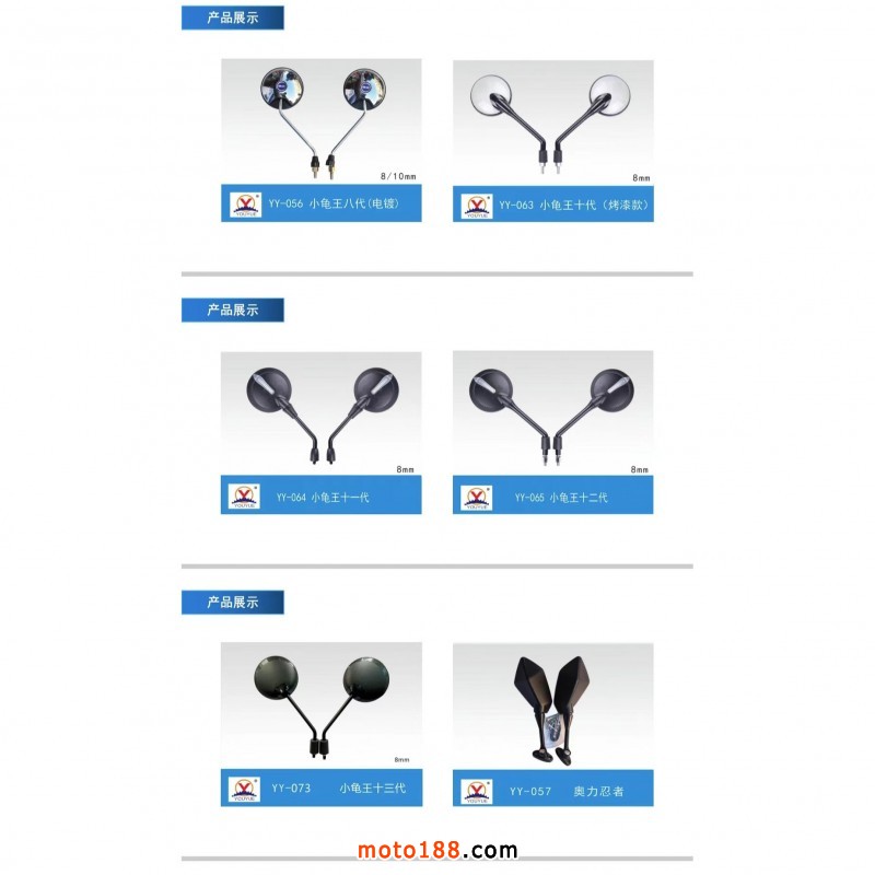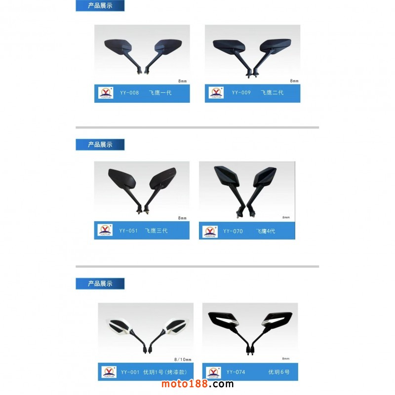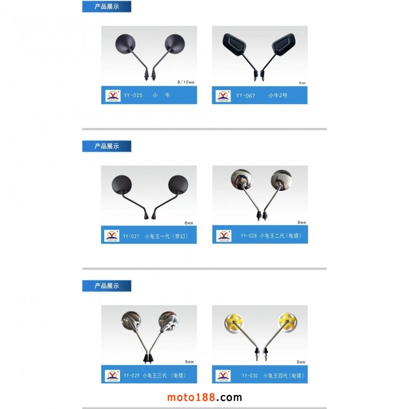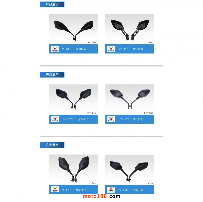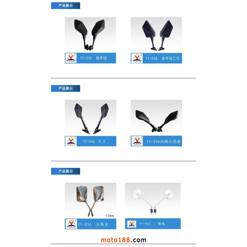 【溫州優玥機車部件有限公司】專業生產電動車、摩托車后視鏡。我們本著質量第一、誠信為本、合作雙贏的理念,真誠的與各位老板合作。聯系電話:15397338877(微信同號)。