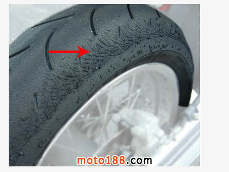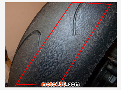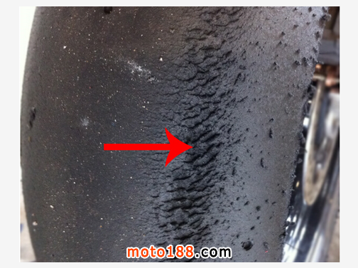 圖上這種狀況是前胎變形量不足,通常是前胎的負荷太小或是錯誤騎姿造成。負荷太小另一個結果就是溫度上不來,輪胎無法維持在工作溫度。
