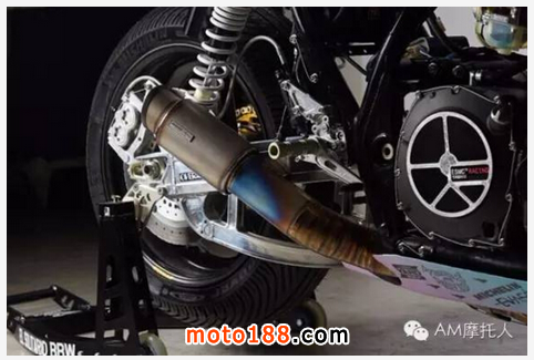 車輛改裝的重點(diǎn)放在了性能的提升和造型的設(shè)計(jì)上。因此,除了車架、油箱和車把之外,其他的部件全部為改裝件,這就導(dǎo)致車重驟降了25%,從245kg降到了183kg。同時(shí),通過加大發(fā)動(dòng)機(jī)進(jìn)氣量,提高壓縮比(從9.7:1提高到10.7:1),更換鈦合金的連桿和缸頭等一些列改裝,使得馬力暴增到了148hp。大馬力低配重,引擎輸出的功率比和市面上的運(yùn)動(dòng)型賽車絕對(duì)有一拼,介于BMW S1000 RR 和Ducati 1299 Panigale之間。