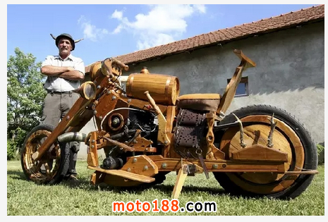 匈牙利的蒂薩厄爾什,普斯卡斯(Istvan Puskas)站在他自制的木制摩托車旁擺拍。普斯卡斯是一名拖拉機手。他花了約兩年的時間用木頭制作了這輛摩托車。