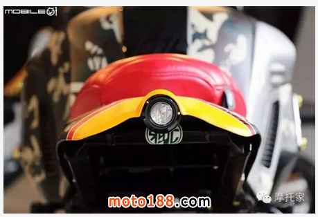 拉近距離,許多車輛改裝的細節漸漸浮現,例如油箱造型就是整臺車最重要的精神所在,上方印有 R9TRACKER,并以迷彩配色做為基底,當然 BMW 的廠徽依然擺放于車輛上,讓人一眼就能認出這臺是 BMW 的車款改裝而來。