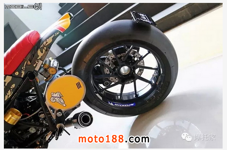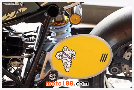 左方腳踏上還有一塊類似賽車號碼牌的設計,但刻意不填上編號的原因據設計者表示,其實是希望讓車輛有種隨時可以參賽,卻又還沒決定正式編號的感觸,因此上端只有貼上輪胎廠商米其林的貼紙,底部的鋁合金也有做舊化處理,增添質感。