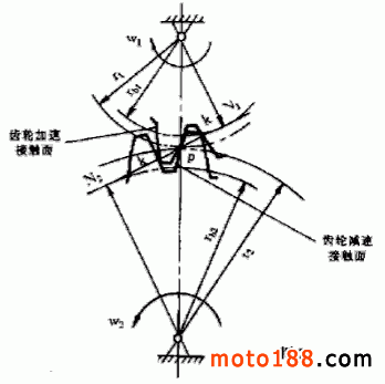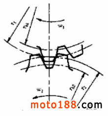 故障:發動機后傳動部分的兩圓錐齒輪齒面磨損嚴重。該故障的表現特征是車輛行駛時,急回油門,發動機內部出現異常響聲。經開箱檢查,發現發動機后傳動部分的兩圓錐齒輪 1 、 2 (見圖1 )的齒面磨損嚴重,齒節以上幾乎磨去 1/3 ,有人懷疑該故障是由于發動機機匣缺潤滑油造成的。