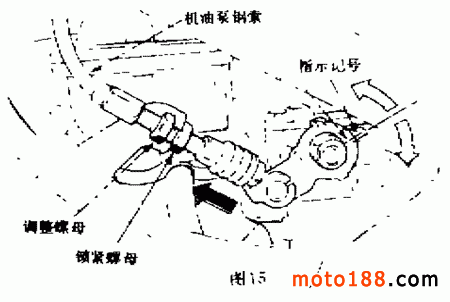 ( 1 )機油泵鋼索的調(diào)整將油門轉(zhuǎn)把轉(zhuǎn)到極限位置,此時,機油泵上的指示記號應(yīng)與控制桿上的記號對齊,如圖 15所示。如果沒有對齊,則松開鎖緊螺母,轉(zhuǎn)動調(diào)整螺母,使這兩個指示記號對齊,然后再擰緊鎖緊螺母。