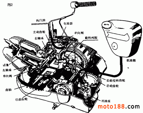 另一種分離潤滑方式是 CCI 潤滑系統(tǒng),這是鈴木系列摩托車專用潤滑系統(tǒng),其結(jié)構(gòu)形式如圖 2所示。這種潤滑系統(tǒng)由機油泵將潤滑油通過輸油管道輸送到各個需要潤滑的部位,其中一根輸油管將潤滑油送到曲軸左端軸承,然后經(jīng)曲軸上的油道流入連桿大端,潤滑大端的滾針軸承;另一根輸油管將潤滑油輸送到曲軸右端軸承和旋轉(zhuǎn)閥盤,在離心力作用下,旋轉(zhuǎn)閥盤上的潤滑油被甩到連桿小端滾針軸承、活塞及汽缸壁上,從而起到潤滑作用。鈴木 FZ50 、 FA50 、 A50 、 K90 、 A100 等型號的摩托車均采用這種潤滑系統(tǒng)。
