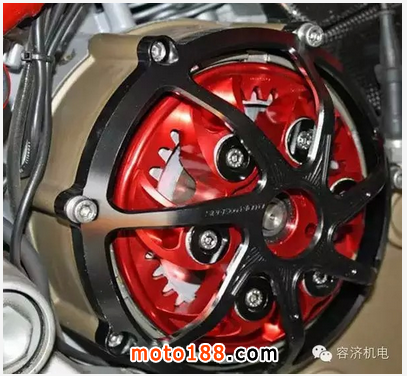 在不需要打洞/液體漏出的前提下,給濕式離合器的蓋子噴漆,或者換成透明的改裝蓋子;另外,濕式離合改干式離合是可能的,Moto Corse就研發(fā)出了1199 Panigale可以使用的干式離合器,不過價(jià)格嘛,哥只能呵呵了,4300美金起的售價(jià)應(yīng)該足夠打消你耍酷的“幼稚”需求。